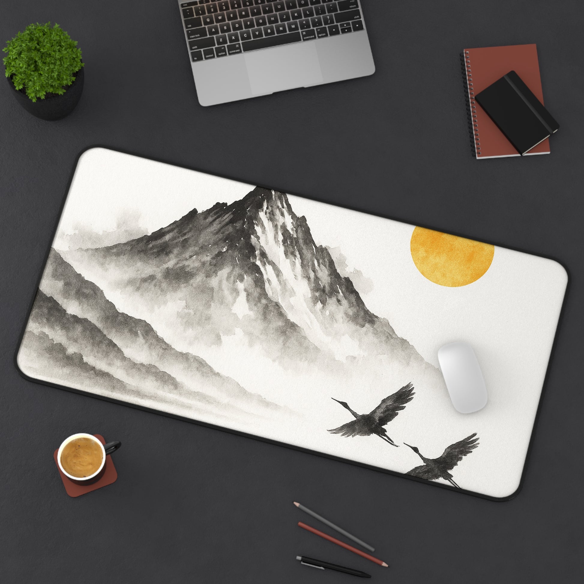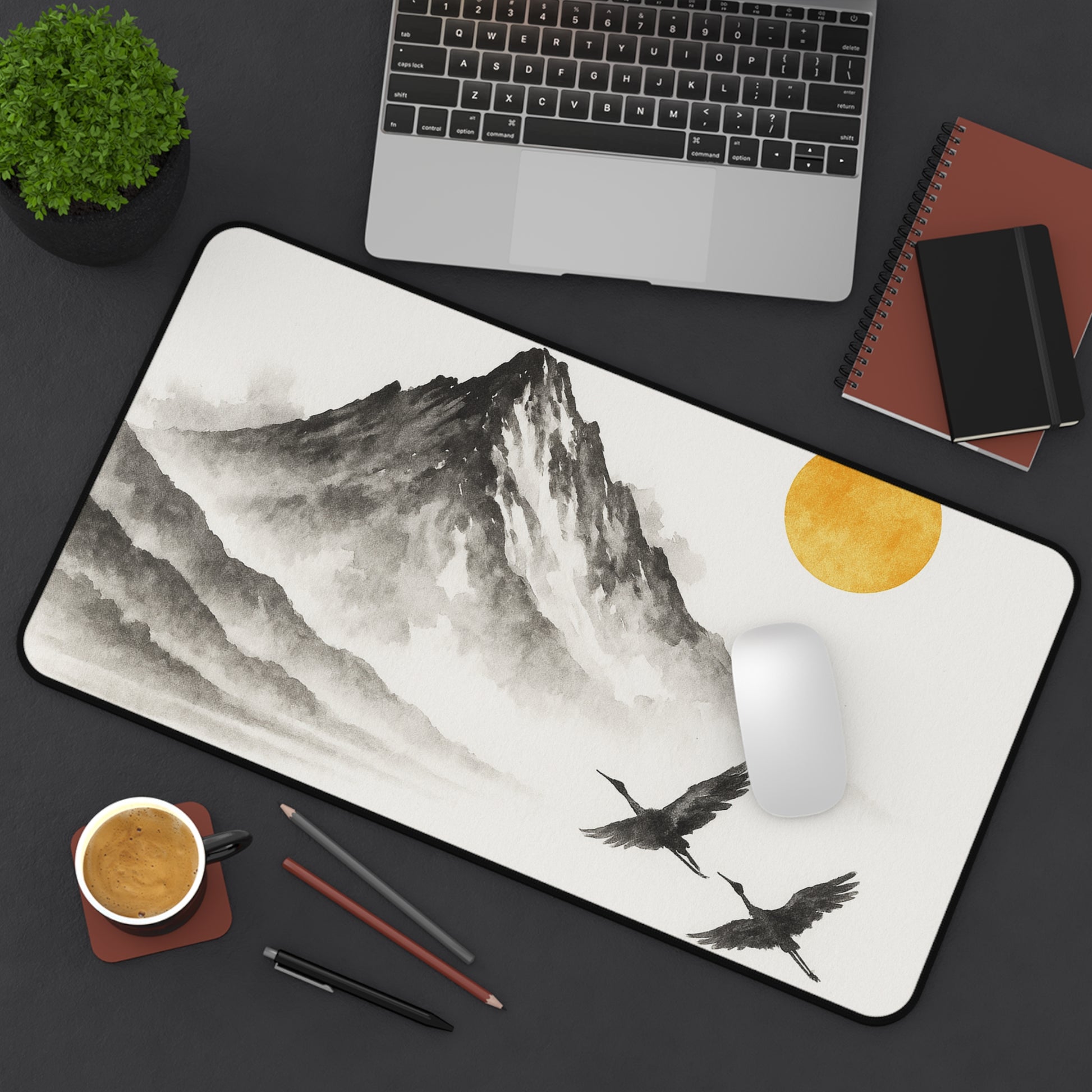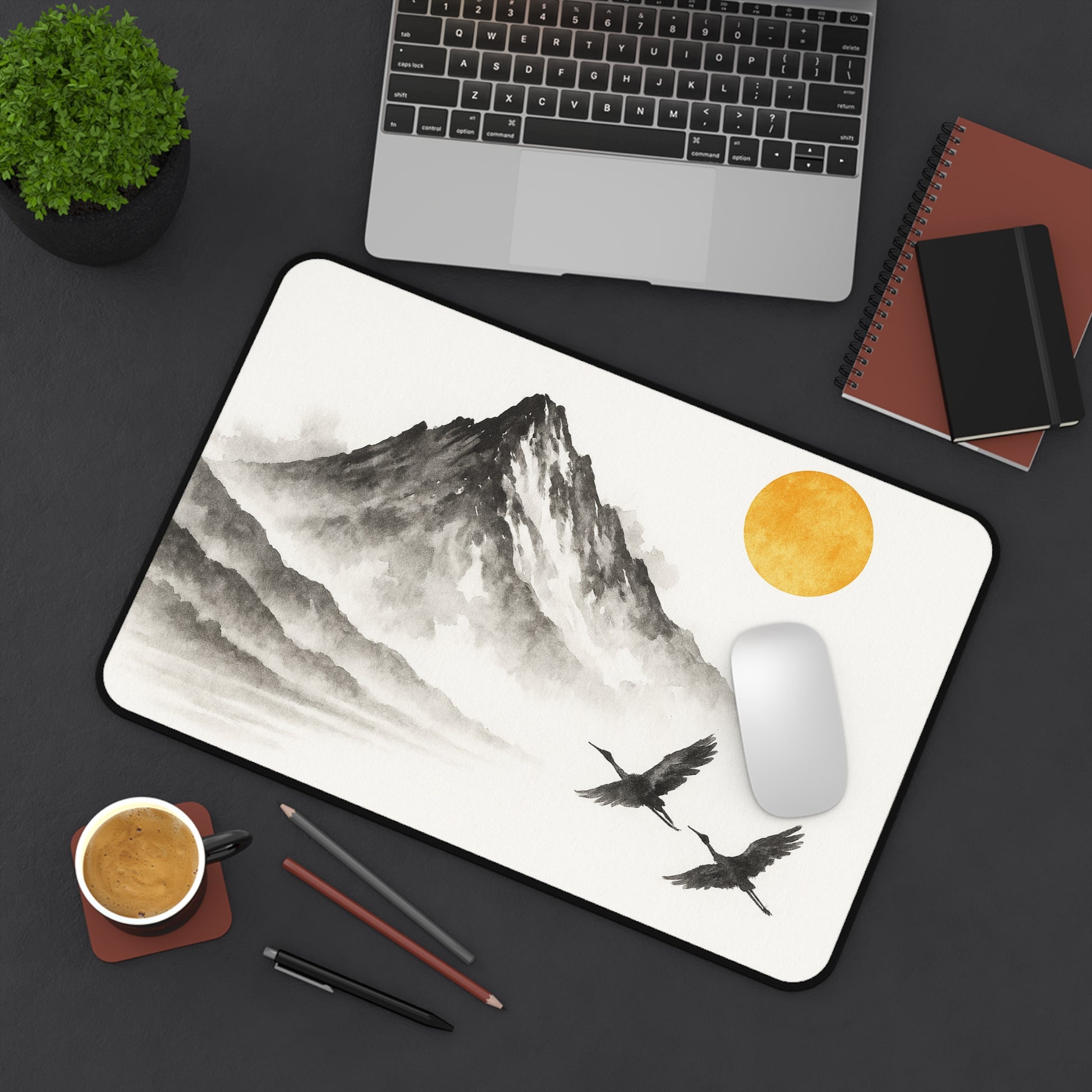 Mountain & Crane Desk Mat | Japanese Style Desk Accessory, Office Decor, Gift for Home Office, Minimalist Workspace, Nature Lover