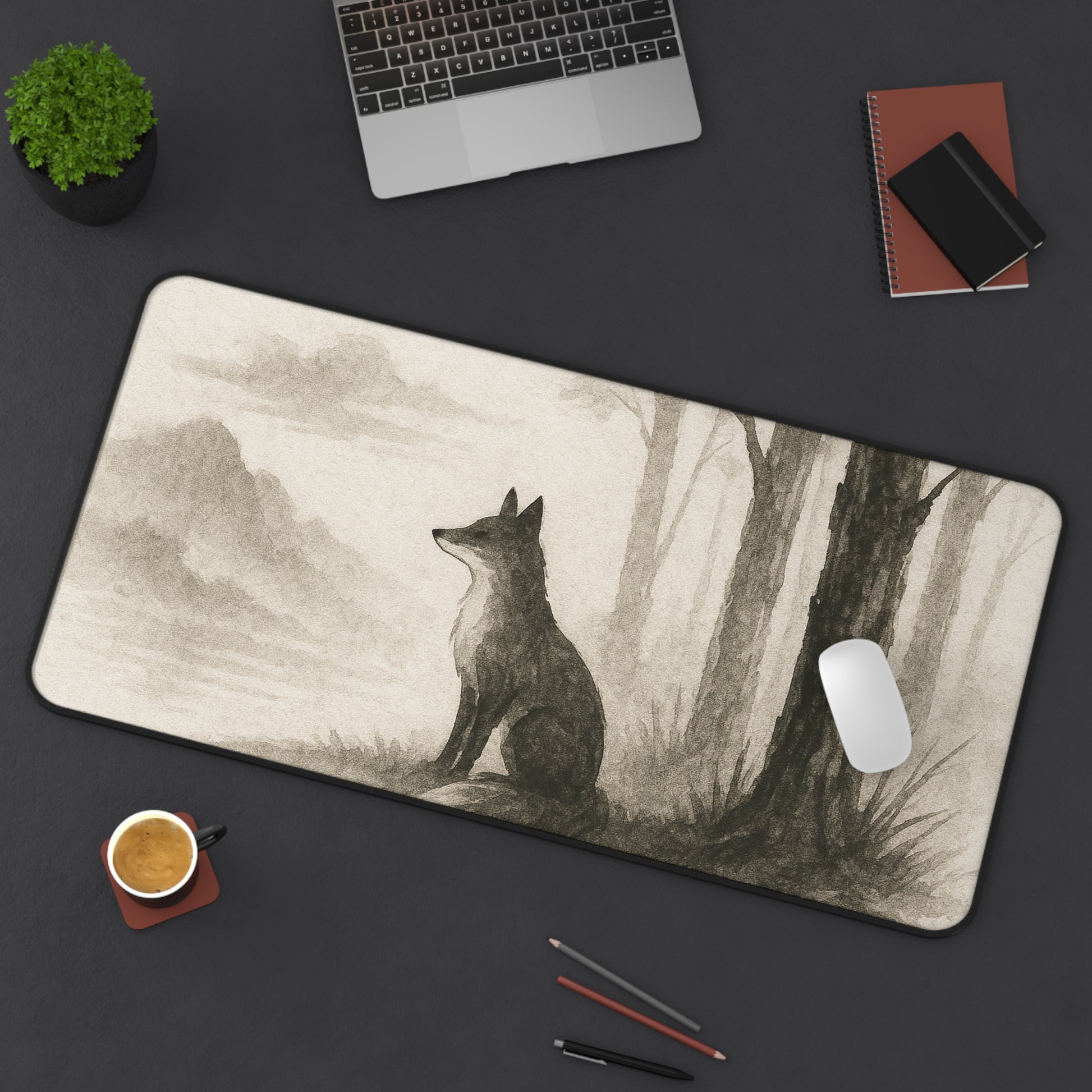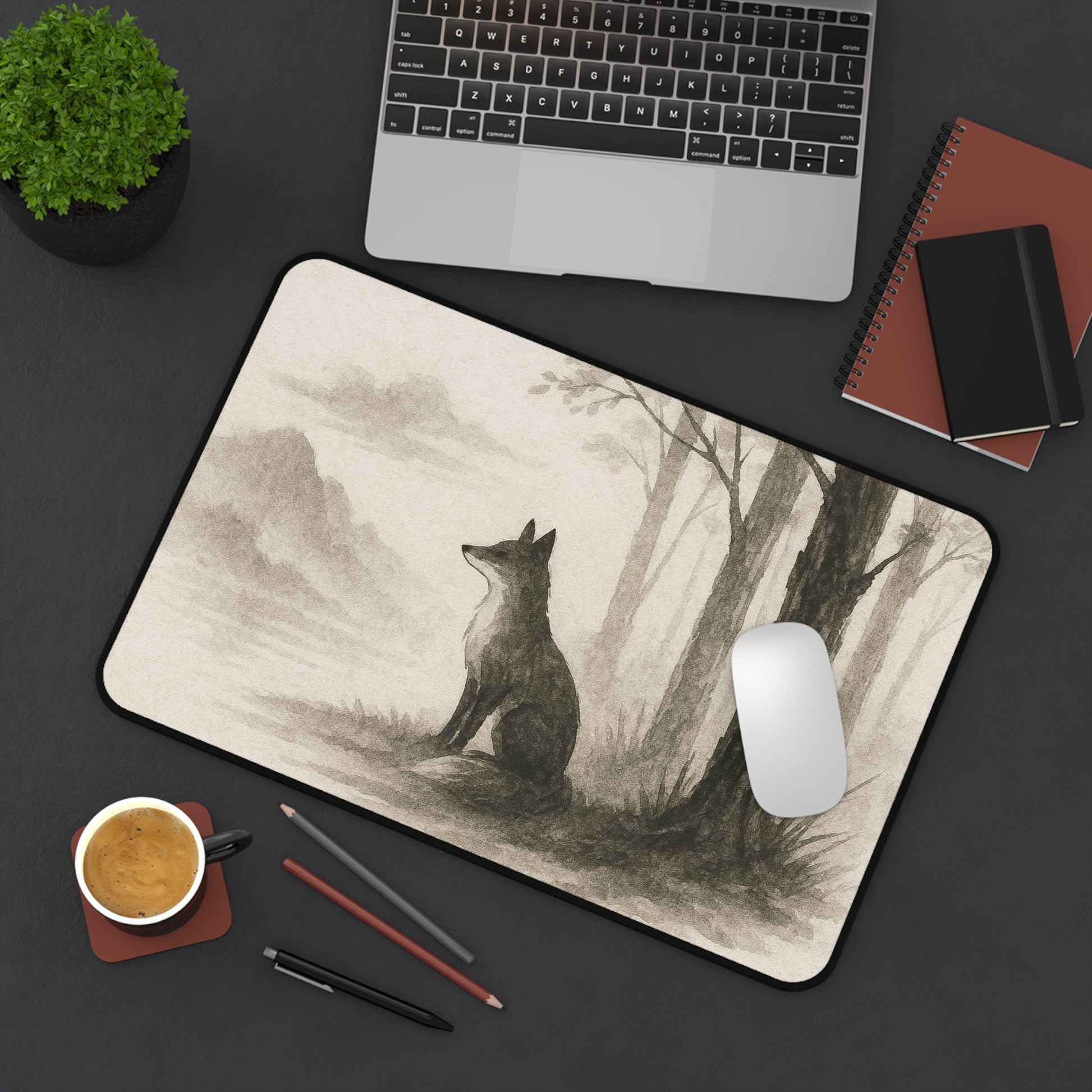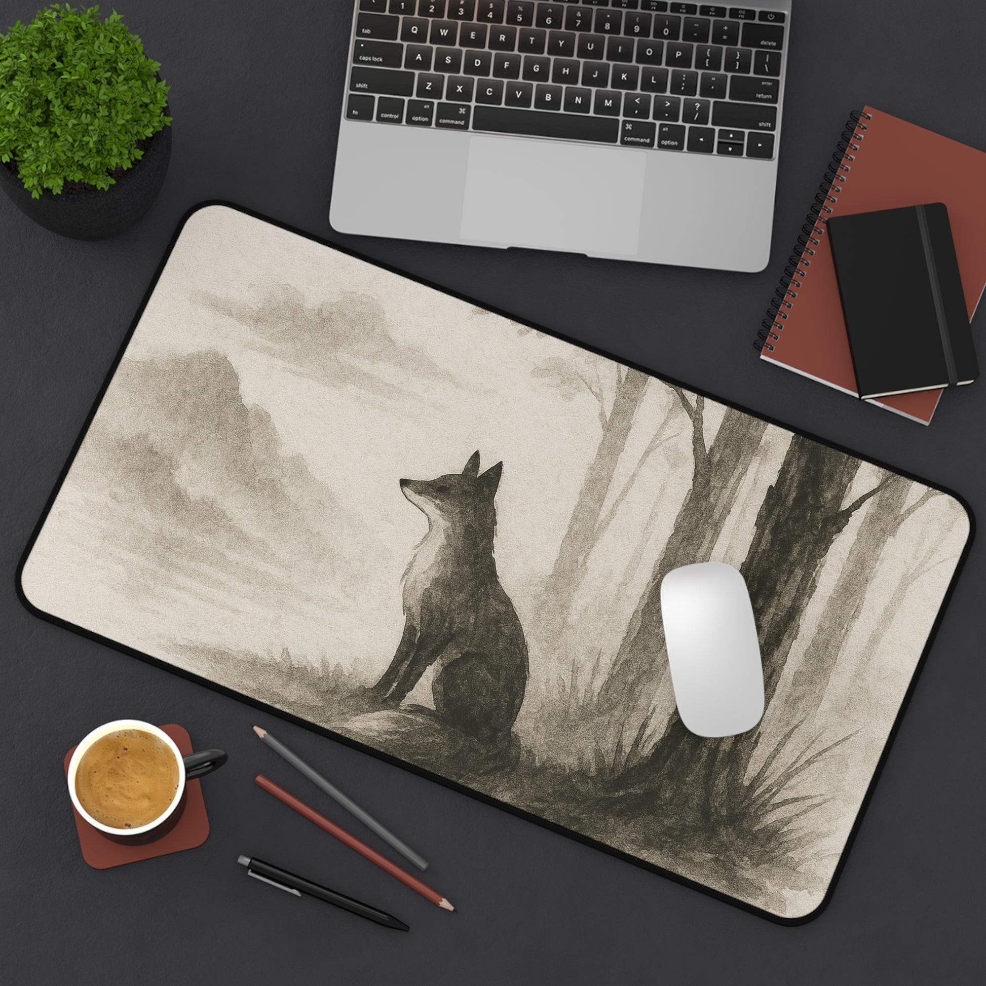 Serene Woodland Wolf Desk Mat - Elegant Office Decor for Nature Lovers